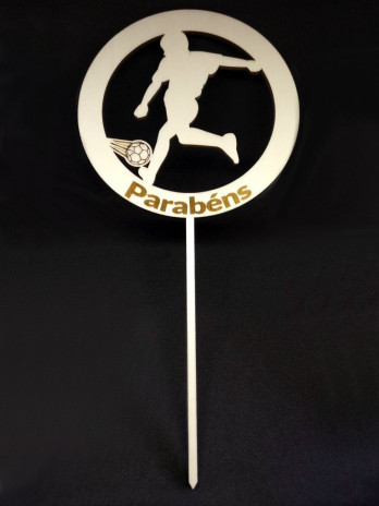 Um magnifico e imponente topper ou topo para bolo com o tema futebol e a inscrição Parabéns. Super resistente e fabricado em chopo.