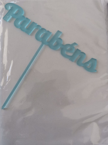 Topper ou topo para bolo de aniversário com a palavra Parabéns na cor azul em acrílico.