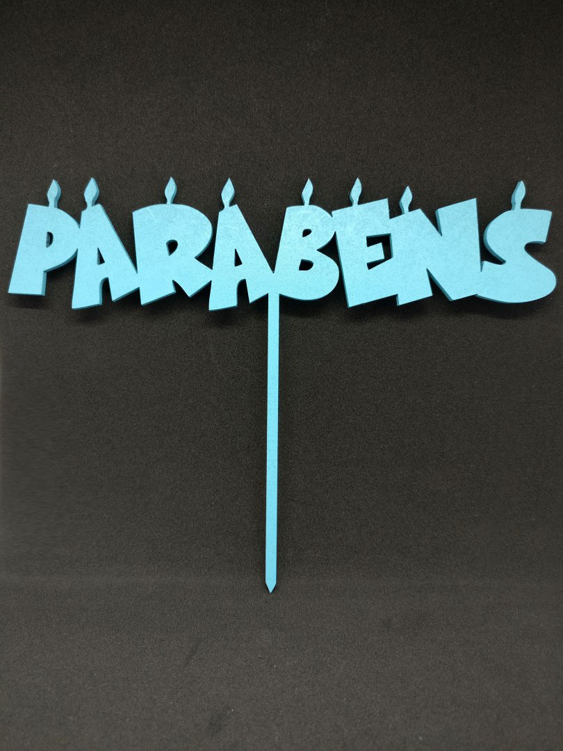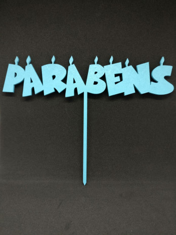 Topper ou topo para bolo de aniversário com a palavra Parabéns na cor azul e pequenas chamas de vela na parte superior das letras. Também disponivel em ouro, prateado e rosa.
