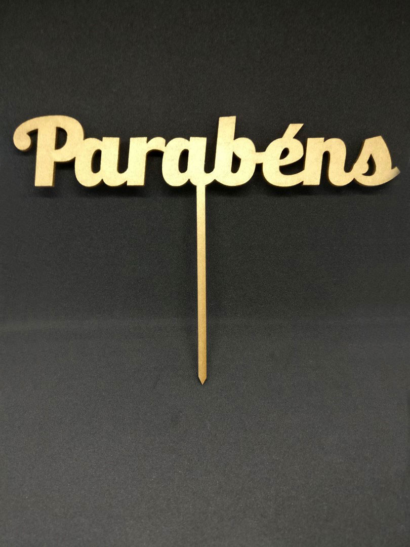Topper ou topo para bolo de aniversário com a palavra Parabéns em tom dourado/ouro.
