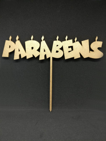 Topper ou topo para bolo de aniversário com a palavra Parabéns em tom ouro/dourado e pequenas chamas de vela na parte superior das letras. Também disponivel em prata, azul e rosa.