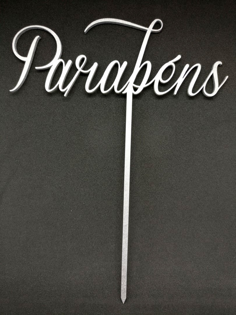 Topper ou topo para bolo de aniversário com a palavra Parabéns em prata ou prateado com letra elegante em estilo clássico. Também disponivel em ouro, rosa e azul.