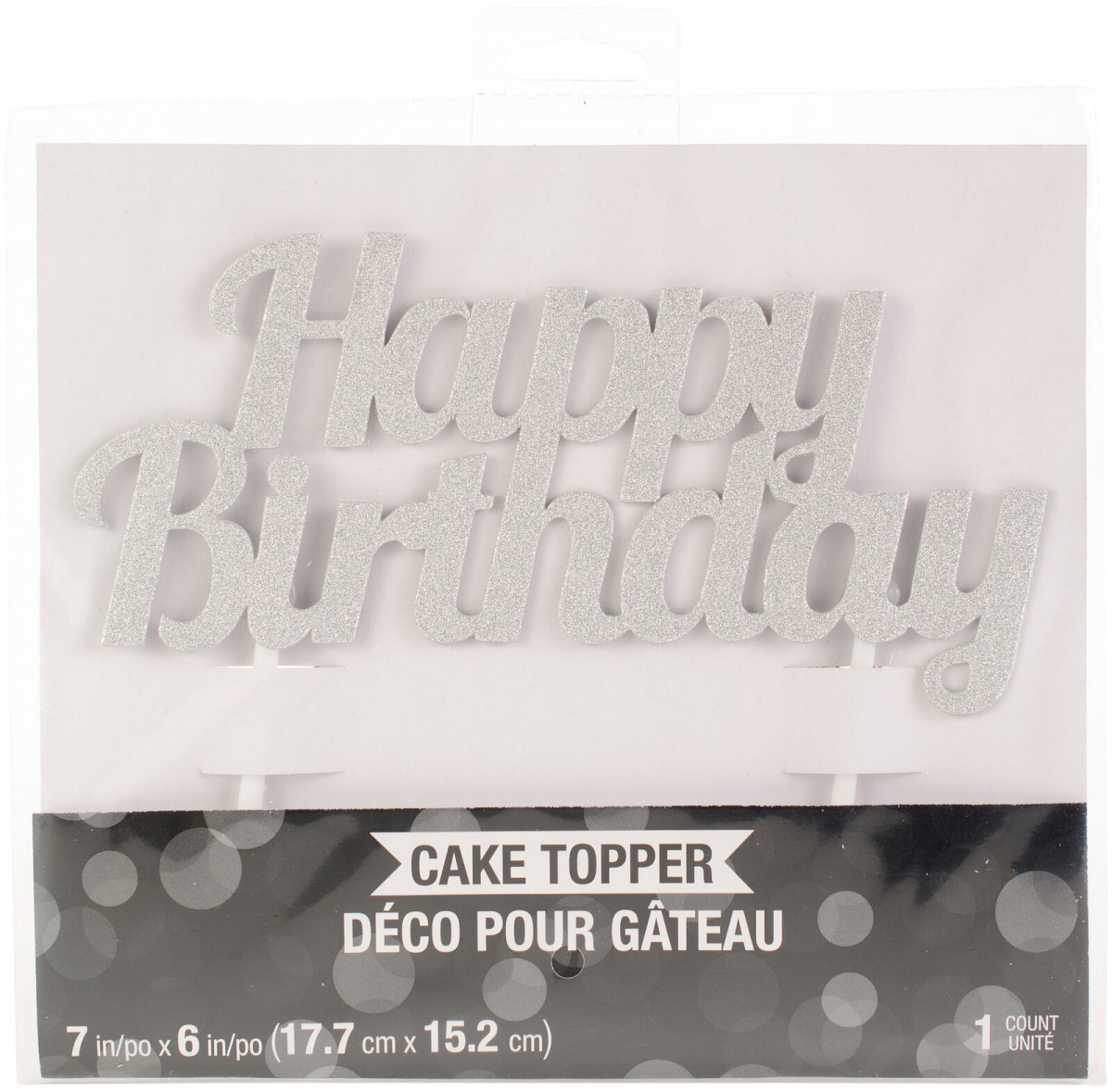 Topper prateado para bolo de aniversário. Contém a palavra inscrita "Happy Birthday", com letras brilhantes.