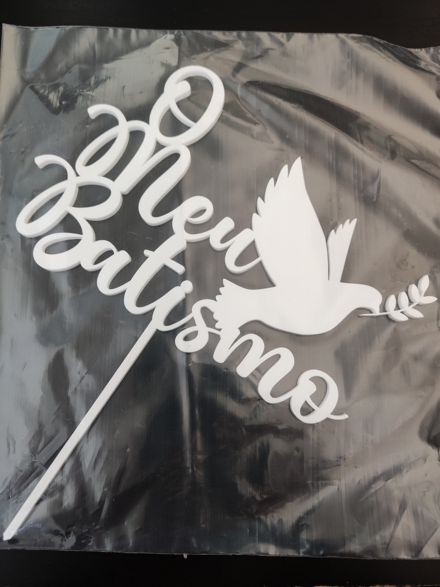 Topper para bolos de batizado em acrílico branco com as dimensões de 16 x 19 cm.