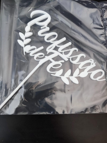 Topper para bolos de profissão de fé em acrílico branco com as dimensões de 19 x 17 cm.