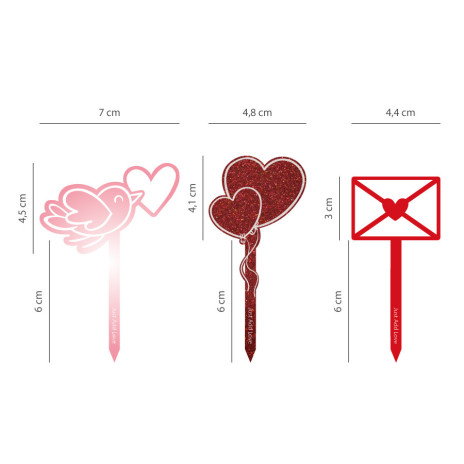 Conjunto de 3 toppers de acrílico com espessura de 3mm, ideal para decoração de cupcakes, bolos, sobremesas para celebrar o dia mais romântico do ano.