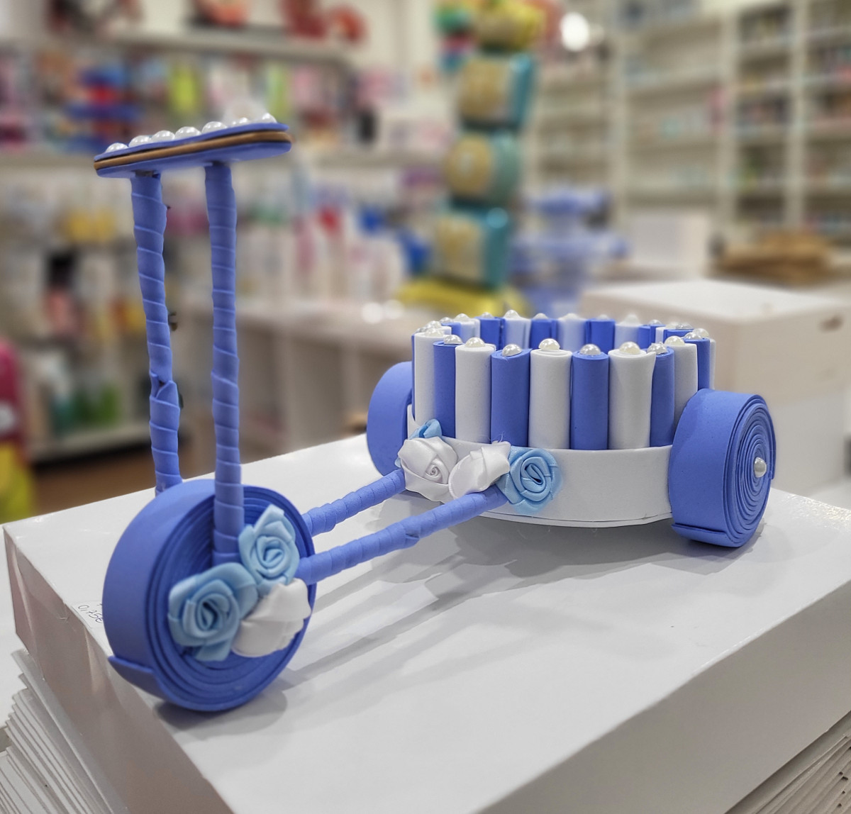 Triciclo em EVA, para decoração de festa, com cerca de 25cm de comprimento. Tem uma base para colocar que desejar, com cerca de 10 cm de diâmetro.