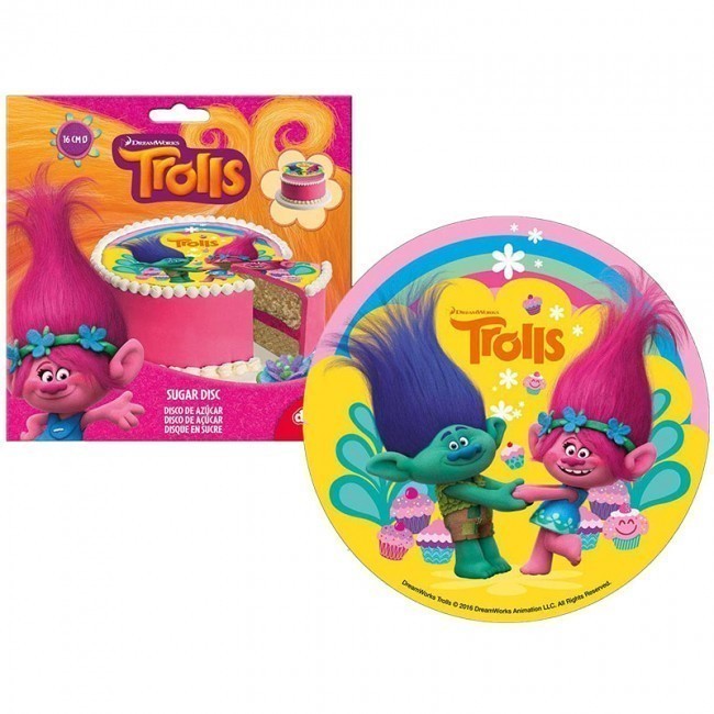 Disco de obreia comestível com imagem das incriveis e cabeludas criaturas Trolls para decoração do teu bolo de aniversário. Diâmetro: 16cm de diâmetro.