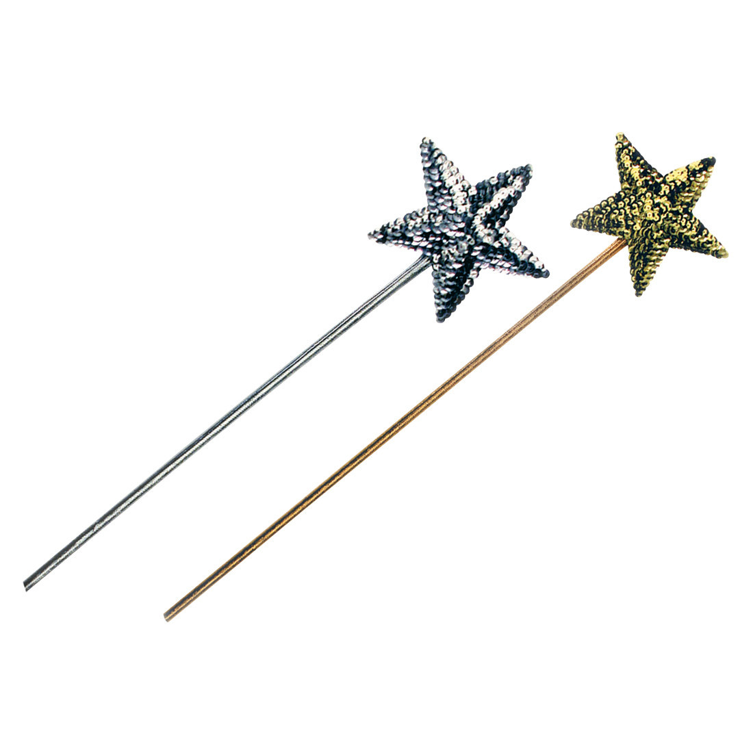 Varinha com lantejoulas em tons de dourado ou prateado com uma estrela.