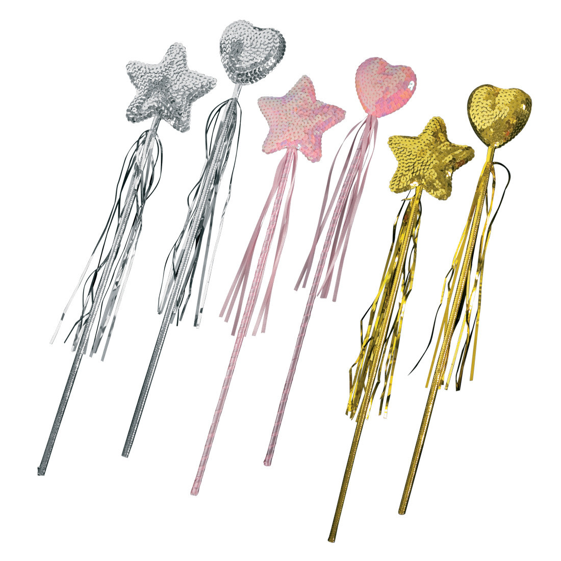Varinha com lantejoulas e fitas em tons de dourado, prateado e rosa. Com um coração ou uma estrela.