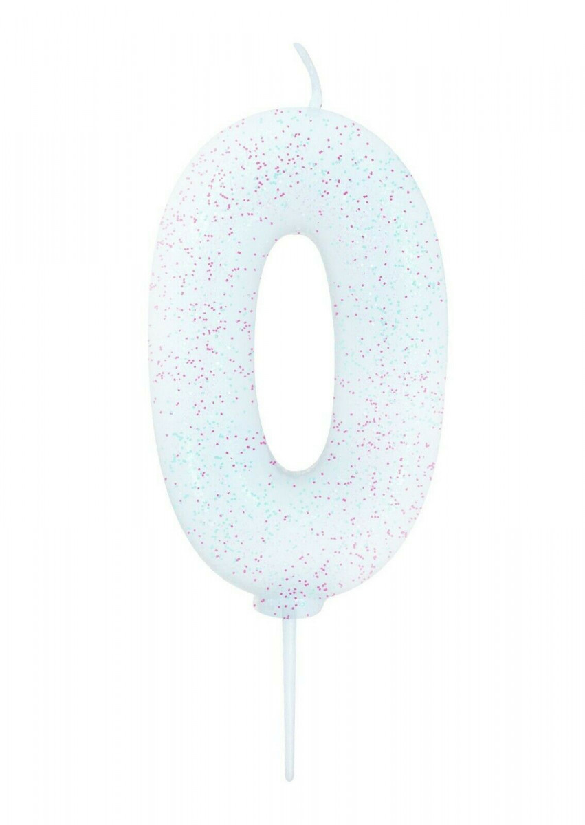 Vela de aniversário número zero em branco com acabamento em glitter iridescente.
