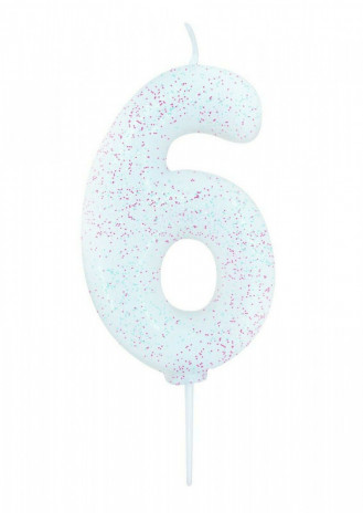 Vela de aniversário número seis em branco com acabamento em glitter iridescente.