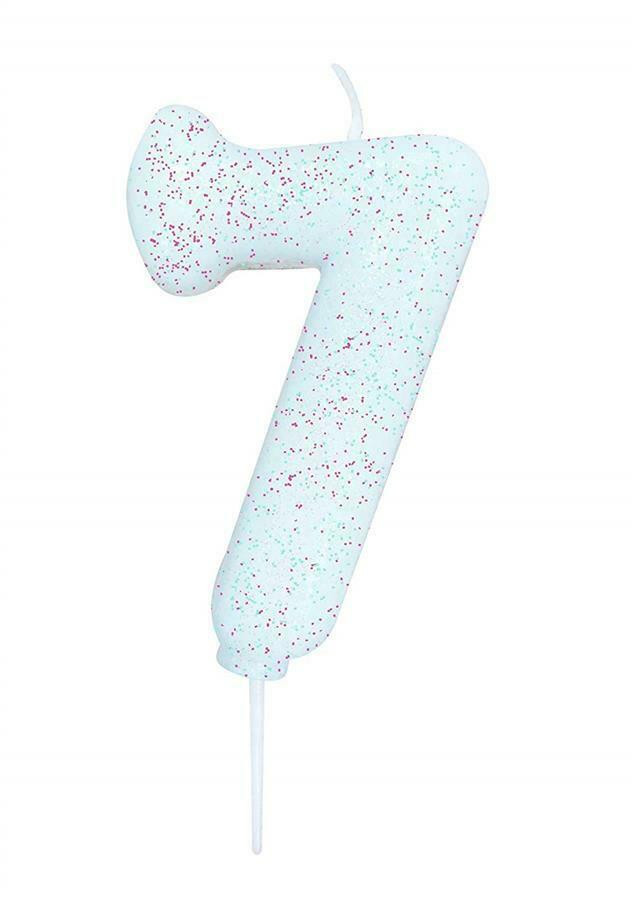 Vela de aniversário número sete em branco com acabamento em glitter iridescente.