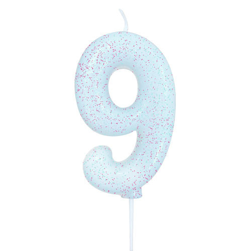 Vela de aniversário número nove em branco com acabamento em glitter iridescente.