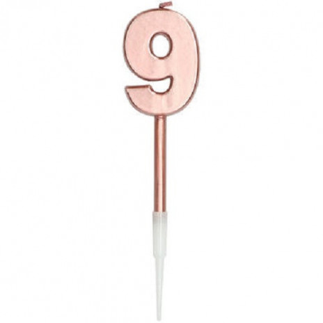 Vela nº9 de aniversário em rosa dourado metálico com cerca de 14cms num estilo contemporâneo.
