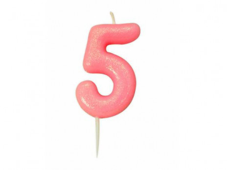 Vela de aniversário número cinco com acabamento em glitter no tom rosa.