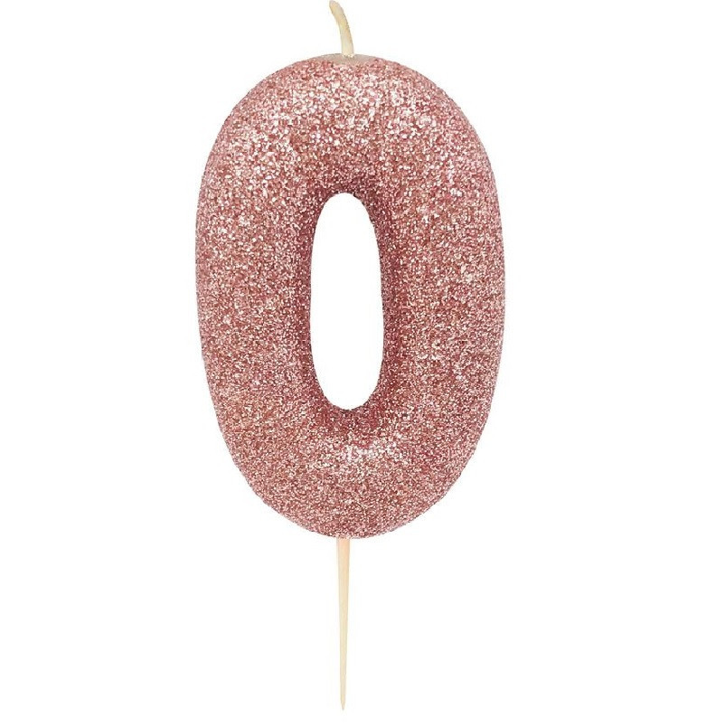 Vela de aniversário número zero com acabamento em glitter no tom rosa dourado.