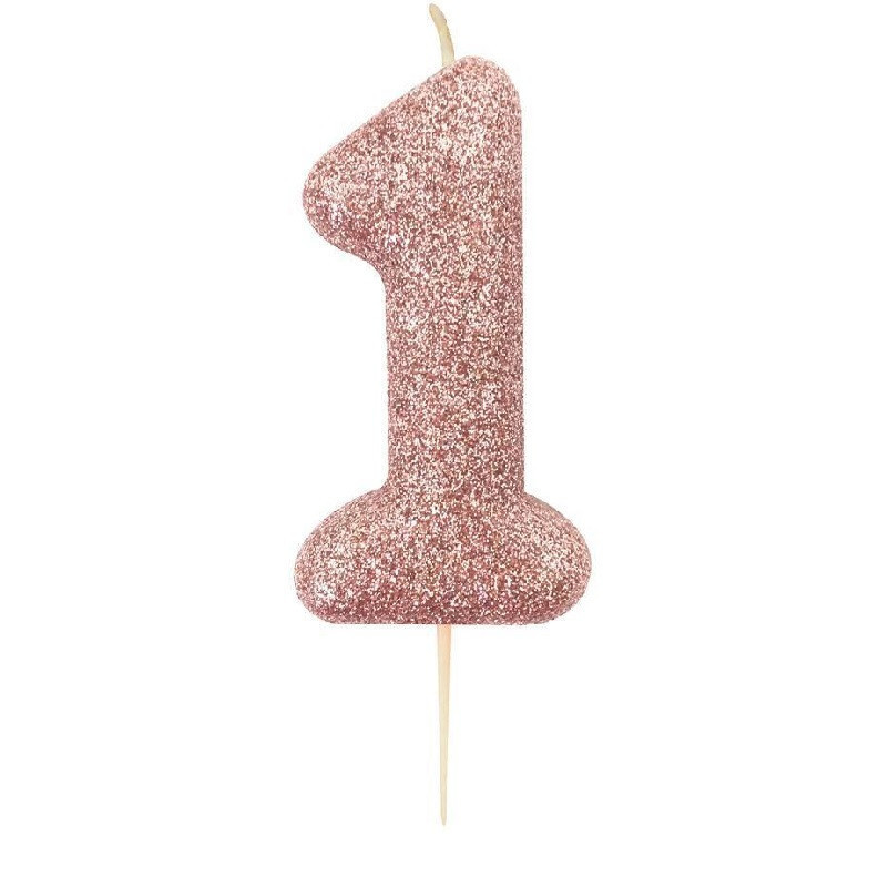 Vela de aniversário número um com acabamento em glitter no tom rosa dourado.