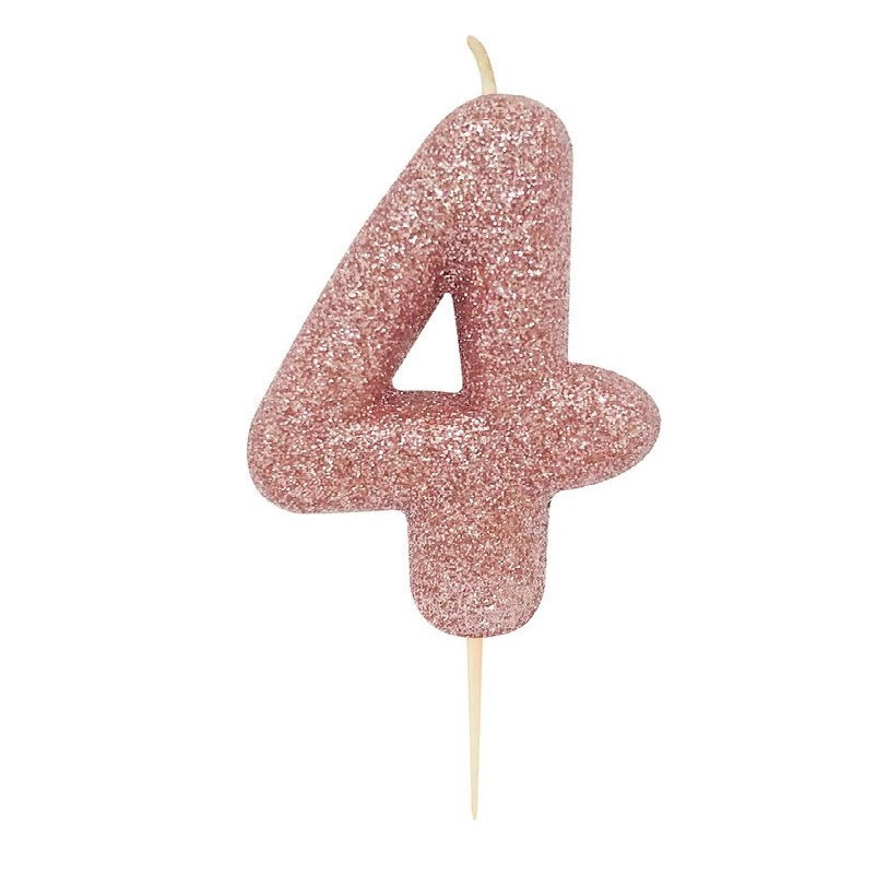 Vela de aniversário número quatro com acabamento em glitter no tom rosa dourado.