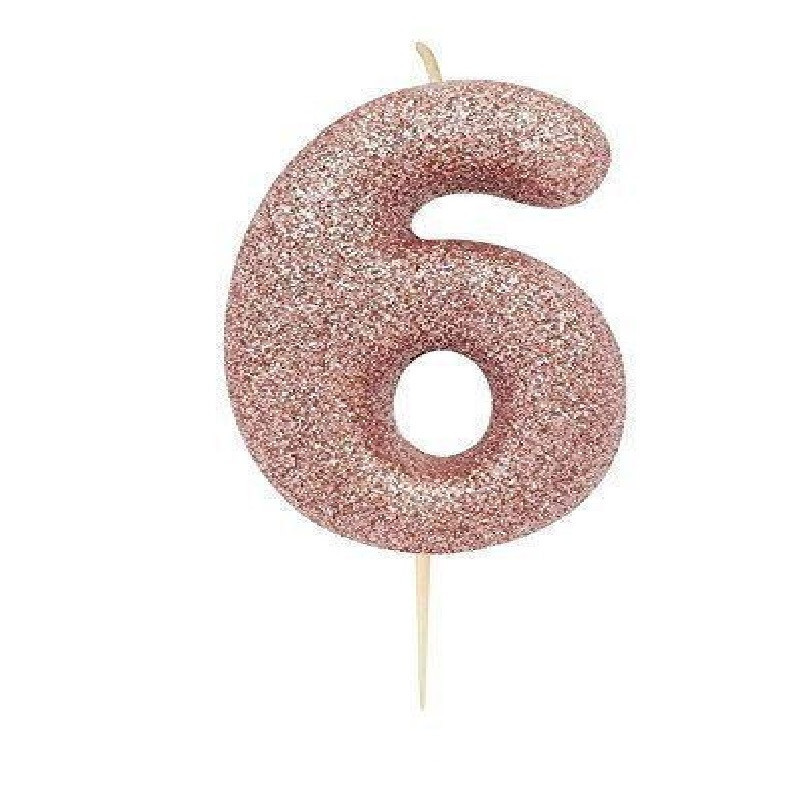 Vela de aniversário número seis com acabamento em glitter no tom rosa dourado.