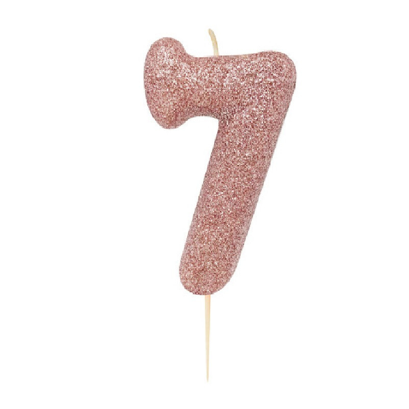 Vela de aniversário número sete com acabamento em glitter no tom rosa dourado.
