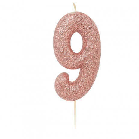 Vela de aniversário número nove com acabamento em glitter no tom rosa dourado.