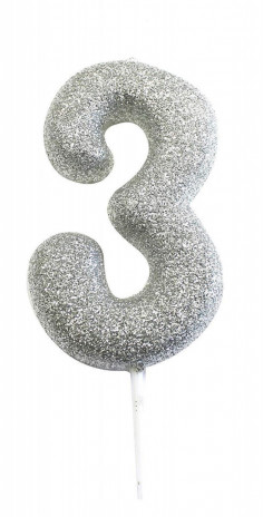 Vela de aniversário número três com acabamento em glitter no tom prata.