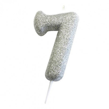 Vela de aniversário número sete com acabamento em glitter no tom prata.