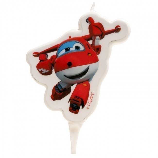 Uma vela em 2D da série Super Wings do Jett para complementar a decoração do teu bolo de aniversário Tamanho: 7 cm.