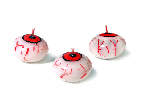 Para decoração, uma vela em forma de olho com raios de sangue para colocar a flutuar na sua decoração de halloween.