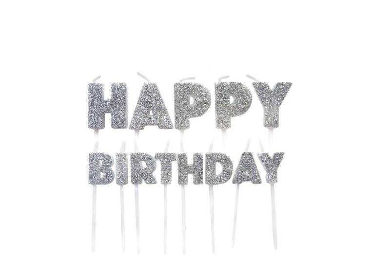 Velas com glitter para bolo para festa de aniversário. Inclui 13 velas em forma de letras "HAPPY BIRTHDAY" em prata.