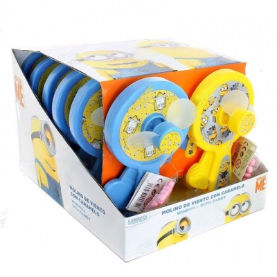 Divertida ventoinha sortida e manual dos Minimos que inclui um pequeno pacotinho de doces de morango. Cor enviada aleatoriamente.